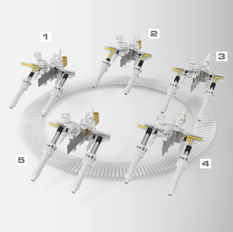 4. Wedges close and screen is fixed and sealed again. Front and rear valves open and the melt flows back into the filter zone.