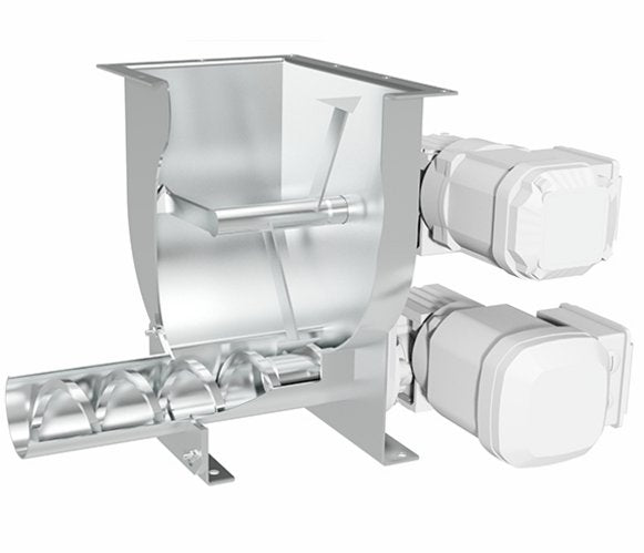 agitator for consistent screw filling and mass flow of ingredient - Separate screw and agitator motors (3 phase AC gear motors),